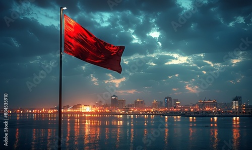 design, flag, realistic, photo, sea, beach, ocean, sky, red, weather, view, evening, dusk, scenic, dramatic, coastline, vacation, nobody, shore, blue, rescue, wind, cloudscape, background, beautiful, bright, attention, sunset, risk, warning, horizon, sun, white, sunlight, seascape, sunrise, tide, tropical, dawn, island, cloud, storm, travel, dangerous, summer, caution