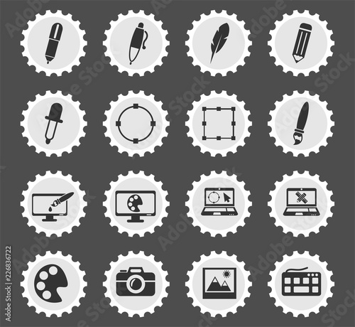 icon, vector, symbol, design, crayons, pen, square, paintbrush, pipette, circle, notebook, ruler, palette, photo, computer keyboard, camera, post, mark
