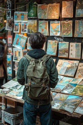Designer working on travel brochure graphics, stock photos and text elements, digital art