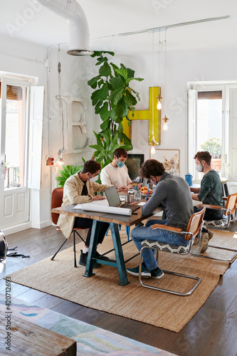 agency, architect, blueprint, brainstorming, business, businessman, businessperson, casual attire, collaboration, colleague, computer, copy space, covering, co-worker, creative, designer, desk, discussion, entrepreneur, face, face mask, group, inside, laptop, meeting, man, modern, new business, office, office worker, people, plan, precaution, prevention, professional, protection, safety, startup, successful, table, talking, team, teamwork, together, wearing, working, workplace, workspace, young