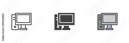 desktop, computer, monitor, icon, line, outline, glyphs, linear, vector, logotype, pictogram, symbol, signs, web, design, illustration, graphic, set, solid, full, filled, style, version, colours, colourful, hollow, blank, technology, wide, lcd, display, screen, case, tower