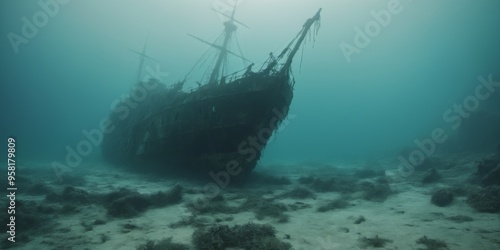 shipwreck, ocean, underwater, sea, fog, haze, green, dark, mystery, ghostly, abandoned, debris, rusted, weathered, broken, window, scattered, dilapidated, old, hull, water, colours, floor, rock, seaweed, rock formation, cliff, face, background, boulder, submerged, eerie, desolate, wreckage