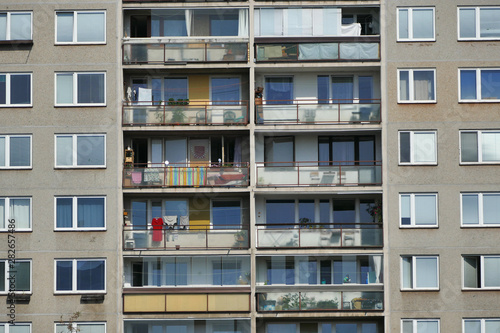 Detail of large panel concrete system-building with flats and balcony, common in Eastern Europe