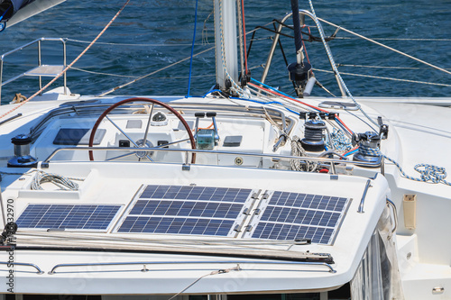detail of steering wheel and navigation instruments of a sailboat