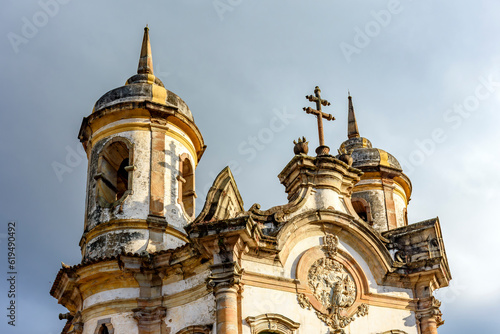 Detail of the facade and towers of a historic baroque church in the city of Ouro Preto in the state of Minas Gerais