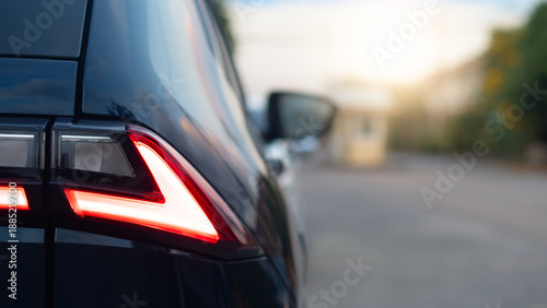 Detail Shot of modern car rear red LED tail light. Luxury automobile exterior part with blurred sunset road background. Transportation and vehicle technology. Parked on the road inside the village.