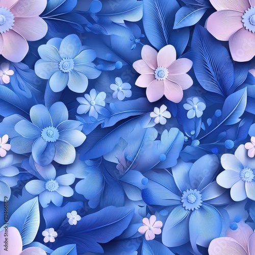 Detailed 3D Floral Embroidery Design with Papercut Elements in Blue and Pink Colors for Repeated Pattern Background