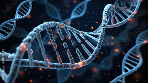 Detailed 3D Render of DNA Molecule Structure with Glowing Orange Particles on Dark Background, Exploring Genetic Code and Biological Processes in High Resolution