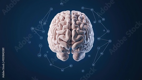 Detailed 3D rendering of a human brain with data connections, representing neuroscience and cognitive function, on a dark background.
