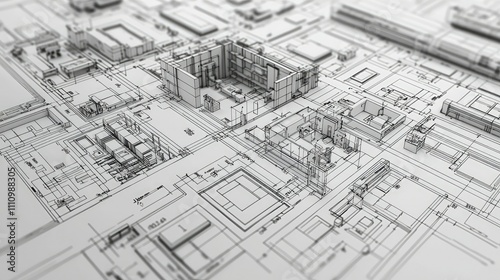 Detailed Architectural Blueprint of City Landscape Showing Complex Structures and Urban Planning Elements in a Monochromatic Design for Urban Development Projects