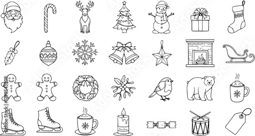 holiday, christmas, holiday, festive, winter, season, celebration, icon, vector, illustration, graphic, doodle, drawing, cartoon, element, symbol, set, collection, outline, black, white, isolated, monochrome, santa, candy, reindeer, tree, snowman, gift, stocking, mistletoe, ornament, snowflake, bell, star, fireplace, sleigh, gingerbread, chaplet, holly, robin, bear, chocolate, skate, candle, cracker, drum, tags