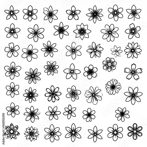 Detailed Black and White Floral Pattern - A Collection of Hand-Drawn Flower Illustrations.