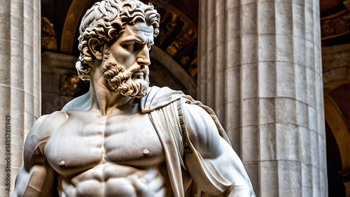 marble, statue, classical, sculpture, muscular, male, figure, greek, roman, god, deity, hero, ancient, bearded, man, closeup, bust, realistic, draped, cape, flowing, beard, hair, serious, expression, thoughtful, anatomy, strong, physique, defined, muscle, pose, stone, pillar, archway, background, architecture, museum, setting, detail, dramatic, lighting, low angle, perspective, centered, chest, arm