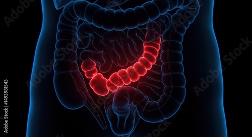 Detailed digital illustration of human digestive system highlighting the large intestine in vivid red