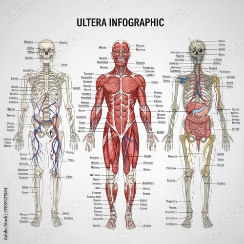 Detailed Human Anatomy Infographic: Skeletal, Muscular, and Internal Organ Systems Diagram for Medical and Biological Study