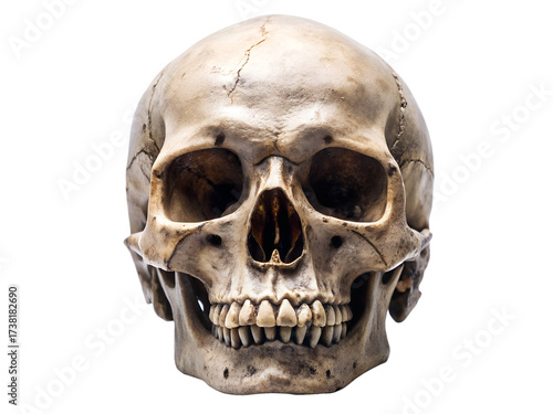 Detailed human skull isolated on transparent background, a macabre reminder of mortality and anatomy