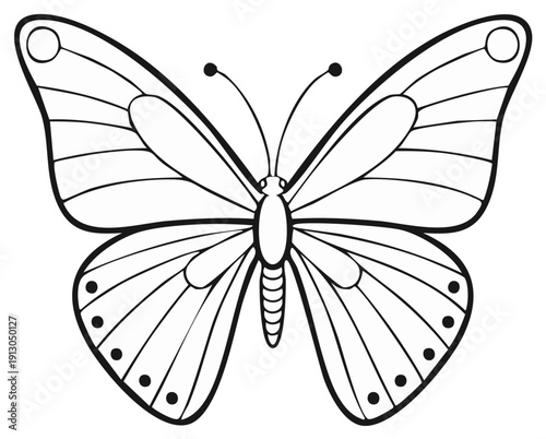 Detailed line drawing outline of a butterfly with symmetrical wings featuring circular patterns and antennae