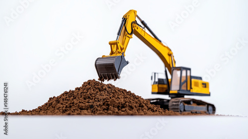 Detailed model of yellow excavator digging into mound of brown soil, showcasing its realistic design and functionality