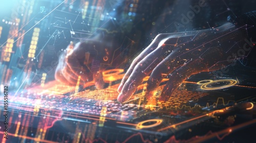 Detailed shot of typing hands, enhanced by a radiant light glow, with binary code streams and dynamic stock graphs overlaying the image, creating a sense of technological advancement.