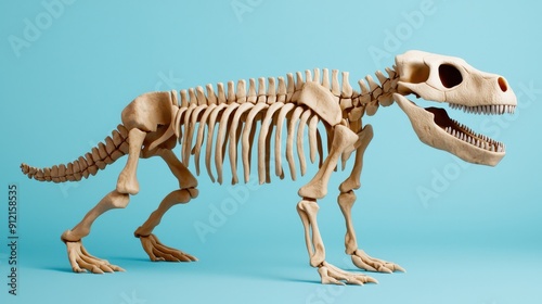 Detailed skeletal model of a dinosaur, showcasing intricate bone structure against a bright blue background.