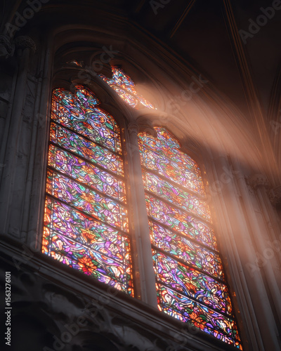 Detailed Stained Glass Window in Gothic Church with Sunlight