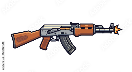 Detailed vector illustration showcases an automatic assault rifle firing a round on a white backdrop