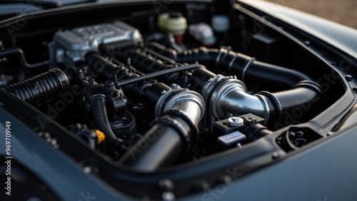Detailed View of a Car Engine with Mechanical Parts and Fluid Systems