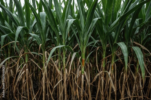 Detailed view of sugarcane stalks developing in a plantation