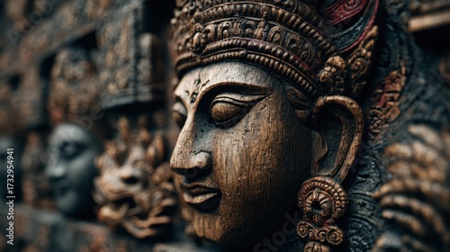statue, wood, carving, deity, sculpture, art, face, ornament, serene, religion, craft, spirituality, intricate, weathered, cultural, heritage, artifact, mythology, historic, ancient, hand-made, traditional, artistic, detail, texture, design, figure, profile, head, closeup, brown, aged, background, ethnicity, decoration, vintage, belief, oriental, old
