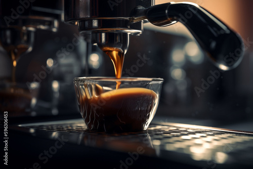 Details of barista preparing fresh espresso on industrial brewing machinery. Generative AI