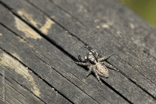 Detalle de una araña sobre madera rugosa. Textura y camuflaje resaltan en esta macrofotografía. Perfecta para proyectos de naturaleza e insectos.