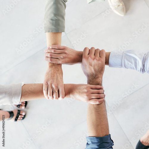 Developing a good work ethic is key. Cropped shot of a group of businesspeople linking their arms in solidarity at work.