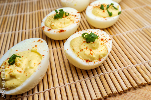 stuffed, angel, egg, egg, mimosa, russian, paprika, dressed, picnic, hardboiled, bamboo, mat, table, wooden, cold, chives, delicious, snack, prepared, yellow, holiday, yolk, rustic, traditional, hard, easter, healthy eating, garnish, scallion, mayo, mayo, mustard, cooked, herb, boiled, food, filled
