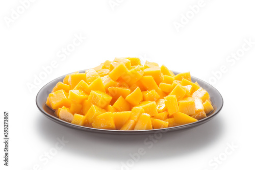 Diced mango in a black plate on white background.