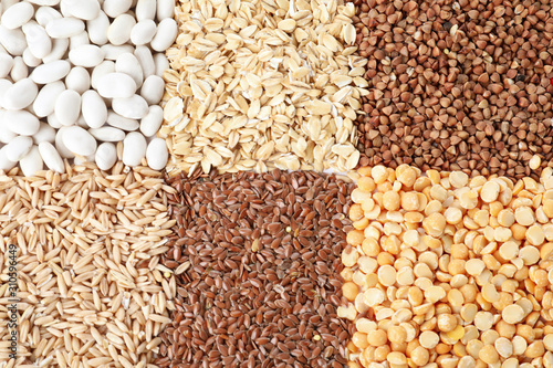 Different grains and cereals as background, top view