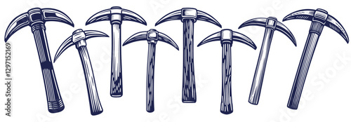 Different types of pickaxes are presented, showcasing various designs and materials, ideal for illustrations related to mining, crafting, or historical tools