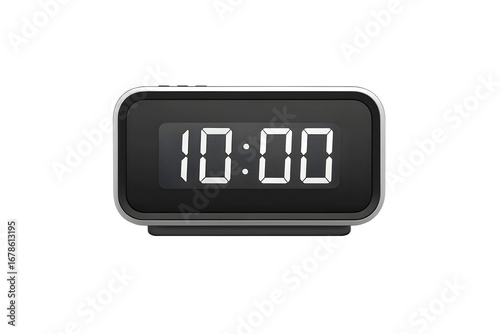 Digital alarm clock with glowing LED display showing 10:00, isolated on white background.