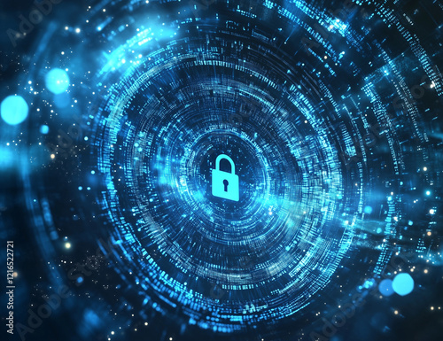 Digital background featuring blue binary code with a lock icon on a dark digital technology and cyber security concept.