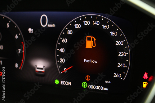 Digital Car miles or Speed of meter with Oli Low Fuel Level Warning Light icon symbol on dashboard. transportation concept.