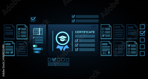 certificate, education, digital, document, checklist, online, interface, graduation, neon, icon, background, learning, diploma, validation, training, approval, technology, school, datum, modern, academic, software, cyberspace, achievement, system, file, electronic, success, progress, cognition, secure, authentication, symbol, verification, concept, futuristic, glowing, abstract, smart, innovation, graphical, form, organisation, structure, efficiency, network, three-dimensional, render, illustration