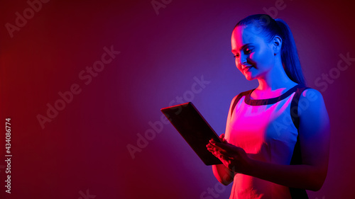 neon, woman, using, tablet, cyber, lifestyle, teleconference, pink, blue, fluorescent, light, isolated, purple, red, copy space, background, digital, communication, future, technology, modern, virtual, business, ict, web, video, call, banner, online, dark, innovation, futuristic, meeting, computer, glow, bright, cyberspace, information, device, caucasian, people, person, adult, female, girl, empty space, copy space