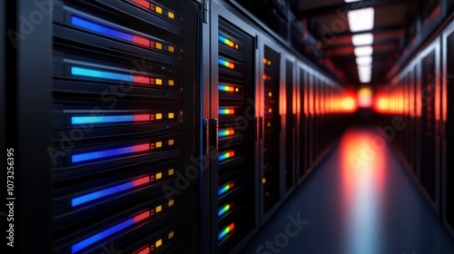 Digital data servers are illuminated by colorful LED lights, showcasing a modern and futuristic data center environment and technological infrastructure.