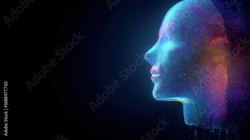 face, digital, particle, glowing, dark, abstract, technology, ai, artificial, intelligence, datum, visualisation, light, colourful, neon, blue, purple, red, orange, profile, futuristic, modern, science, concept, art, design, illustration, background, texture, vibrant, energy, network, innovation, future, human, head, form