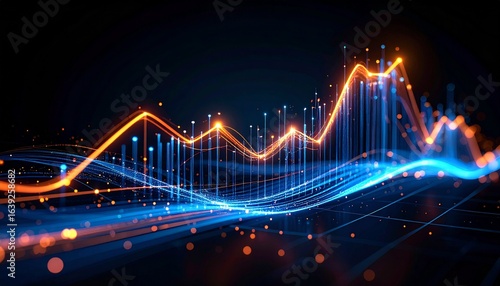 stock exchange, business, technology, digital illustration, abstract, graphic, wave, pattern, orange, blue, trend, market, growth, analysis, investment, trading, chart, graph, performance, visualisation, information, concept, futuristic, modern, innovation, economy, industry, finance, network, algorithm, processing, transformation, future, progress, development, representation, design, artificial intelligence, computer, science