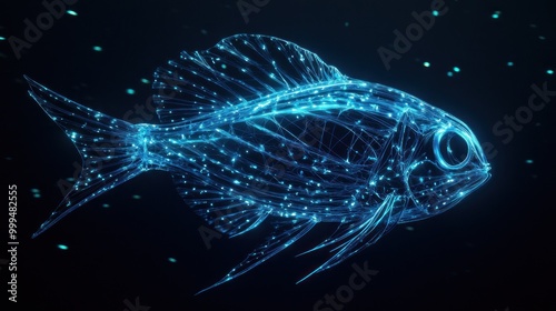fish, digital, art, abstract, blue, ocean, sea, water, glow, bright, sparkle, light, dark, nature, underwater, creature, life, design, graphic, illustration, three-dimensional, render, style, modern, futuristic, technology, science, fantasy, concept, geometric, pattern, texture, line, point, shape, background, space, cosmos, universe, galaxy, particle, network, datum, virtual, reality, neon, luminescence