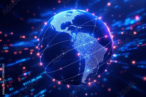 globe, network, technology, background, light, texture, business, global, communication, binary, digital, datum, blue, futuristic, innovation, glowing, connection, cyberspace, cyber, virtual, web, grid, aglow, abstract, energy, bright, system, science, pattern, sphere, planet, design, code, visualisation, concept, modern, interface, progress, dot, structure, interactive, information, transmission, worldwide, ai, generative, illustration