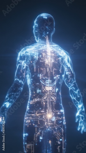 human, body, digital, circuit, technology, datum, science, anatomy, medicals, cybernetic, artificial, intelligence, future, design, network, communication, visualisation, concept, health care, health, research, innovation, abstract, blue, glowing, light, structure, internal, system, outline, silhouette, backview, no people, outdoors, night, conceptual