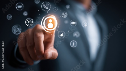 Digital Interaction & Innovative Networking: An expert's finger interacts with an array of digital icons, evoking a high-tech, photorealistic visualization of the connected world.
