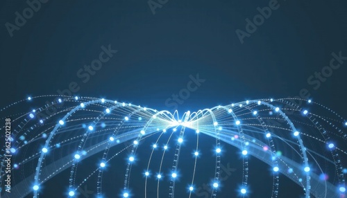 Digital network connections with glowing lights and interconnected nodes representing technology connectivity and data transfer in a futuristic digital environment