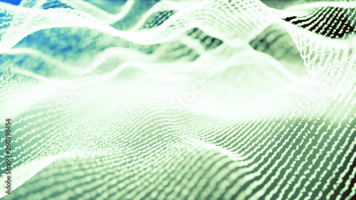 Digital particles floating wave form in the abyss abstract cyber technology de-focus background.